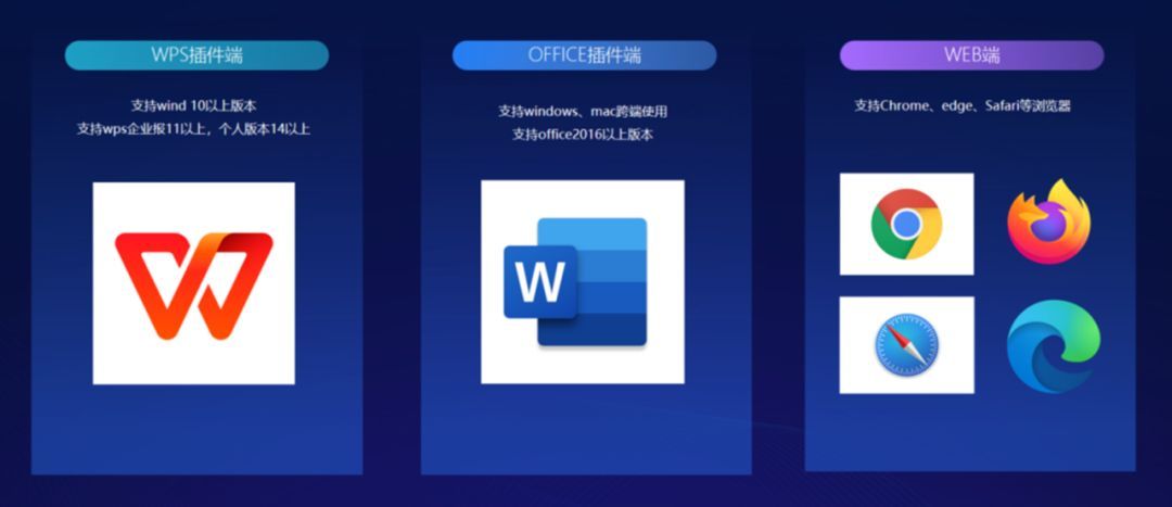 能够同时支持在网页端、WPS 客户端和 Office 客户端完成文档的自动生成,方便业务人员根据公司实际情况以及办公环境,任意切换,且做到三端的数据同步